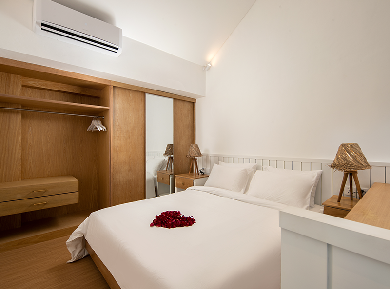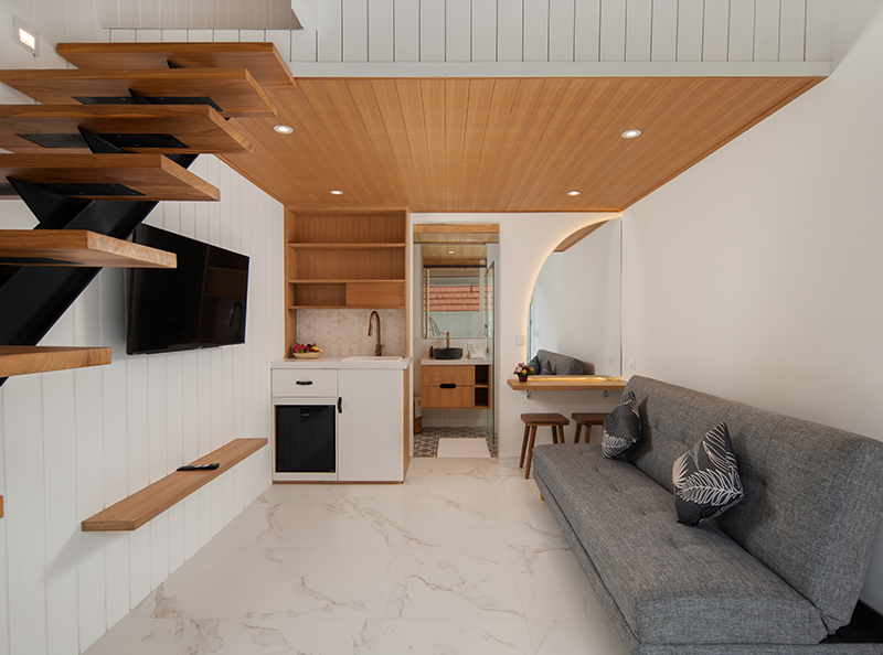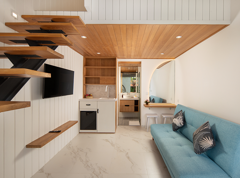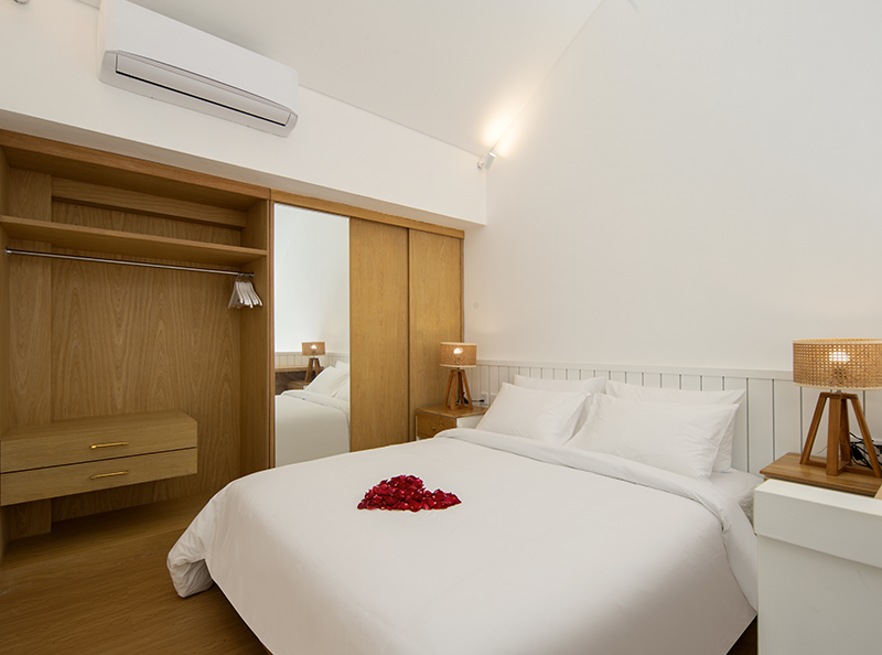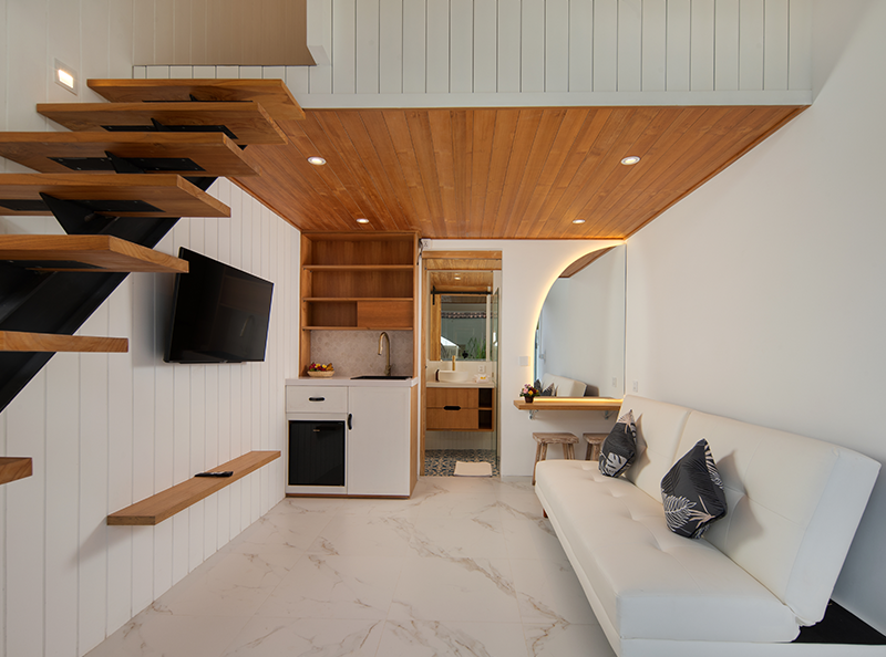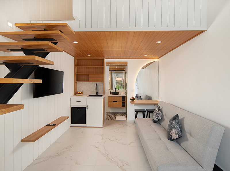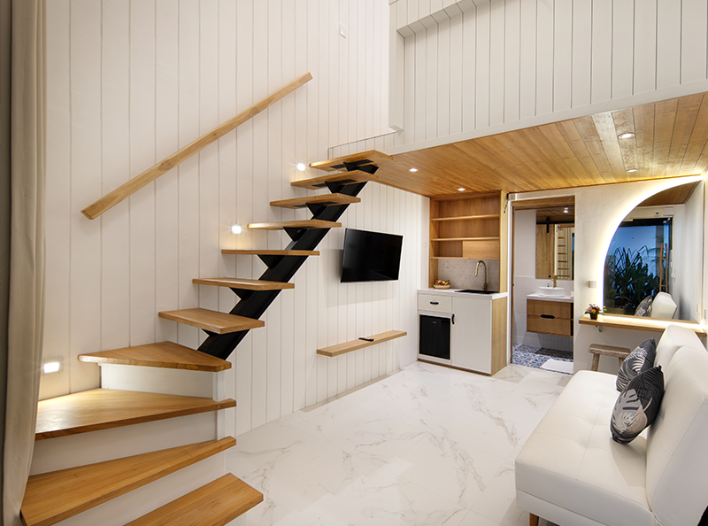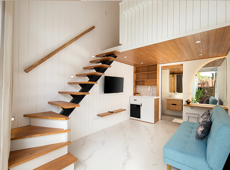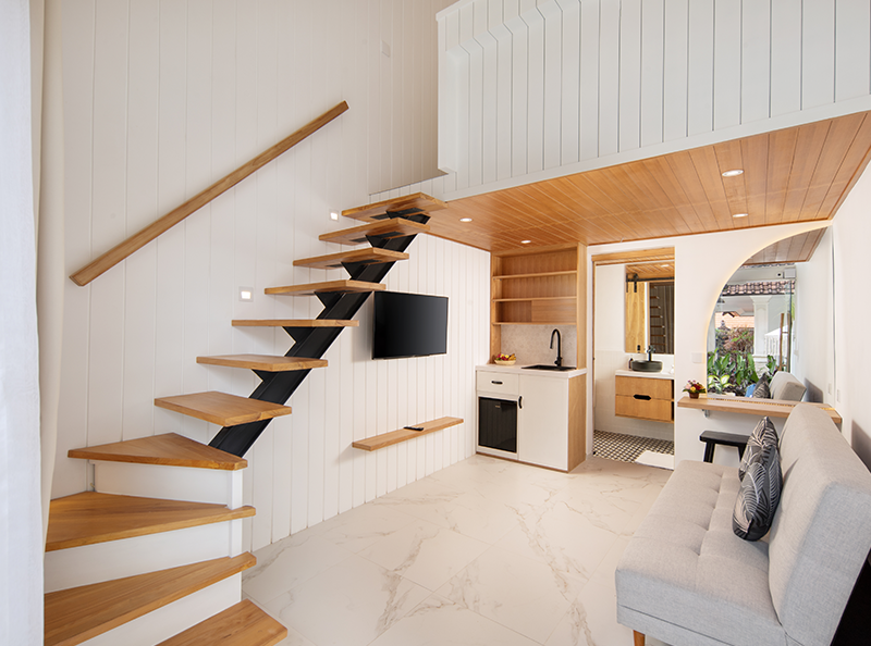 Despite its centraI location, the property provides a tranquil escape, ensuring a serene and restful stay. The estate features four private loft-style accommodations, each thoughtfully designed with a spacious one-bedroom layout, an ensuite bathroom, and modern beach-style, fully furnished interior.